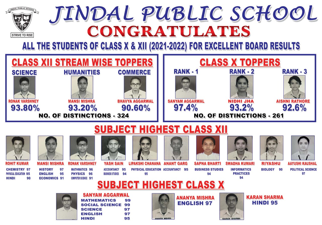 Jindal Public School Congratulates all the students of Class X & XII (2021-2022) for Excellent Board Results. Event Date : 23.07.2022